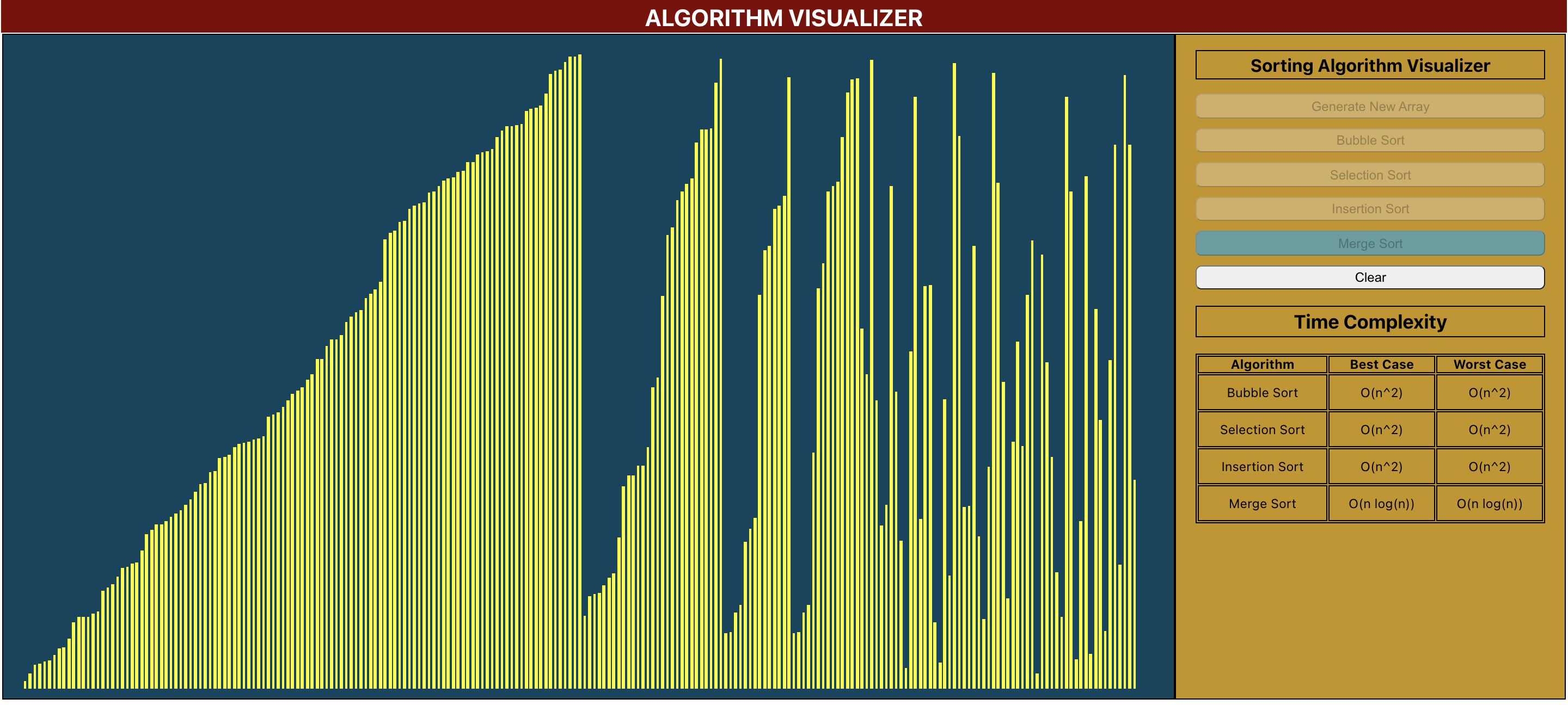 Created a web app to visualize algorithms. Implemented Bubble Sort, Merge Sort, Selection Sort, and Insertion Sort. A table on the side to compare all complexities.